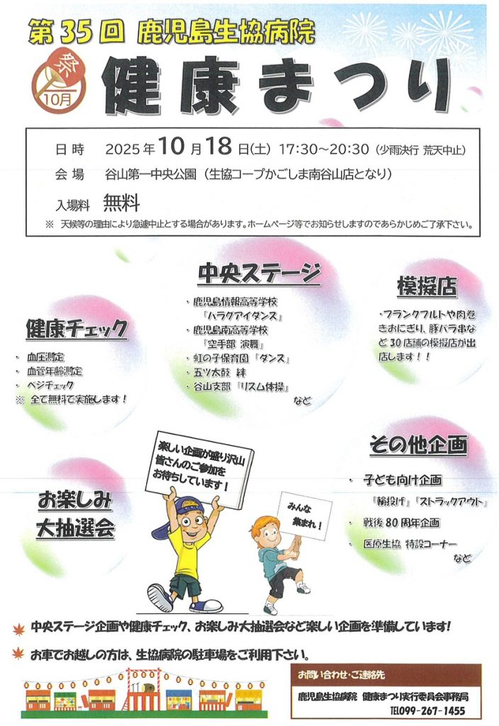 鹿児島医療生協では、地域の皆さまと共に「健康で安心して暮らせるまちづくり」をめざして、第35回健康まつりを開催いたします。健康チェックをはじめ、地域の高校・団体・組合員によるステージ発表、模擬店、大抽選会など多彩な企画を準備しています。